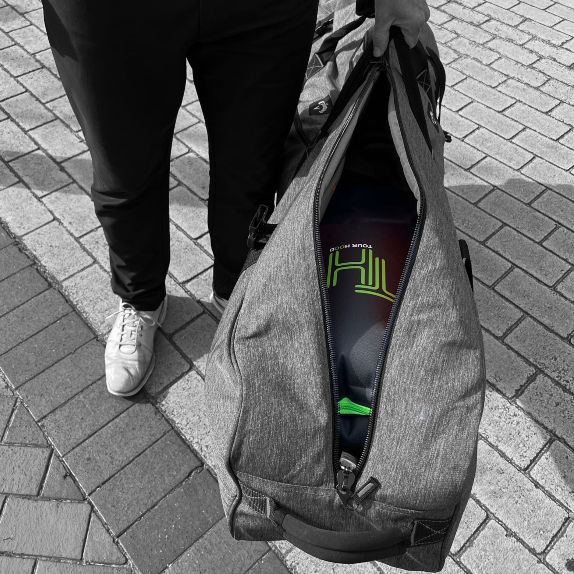 TOUR HOOD is a shock-absorbing, inflatable hood that shields your clubs from impact in transit. It replaces your rain hood, fits inside your bag, and locks your gear in place, no towels, stiff arms, or bubble wrap needed. -